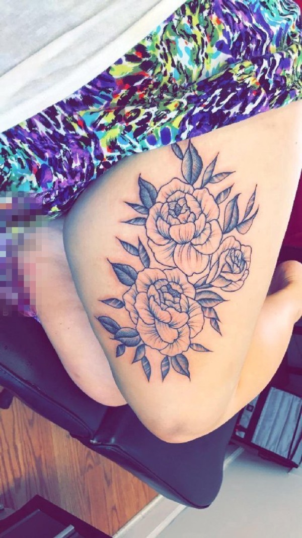 女生大腿上黑灰点刺植物素材文艺花朵纹身图片