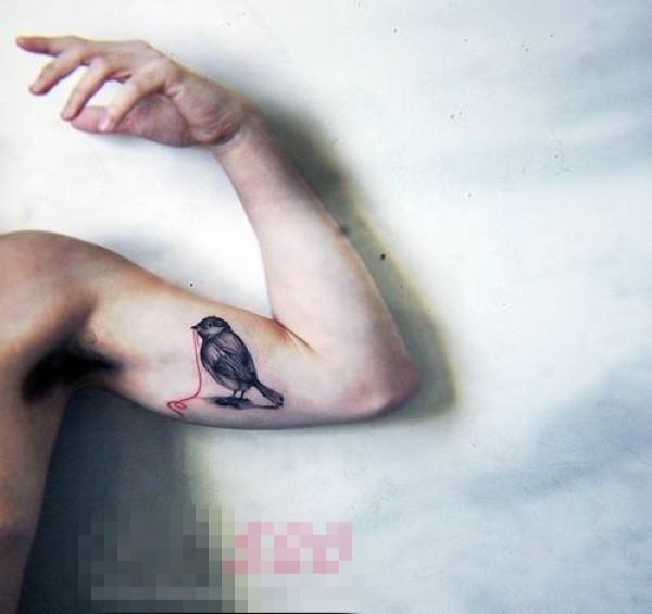男生手臂上黑色线条素描小动物小鸟纹身图片