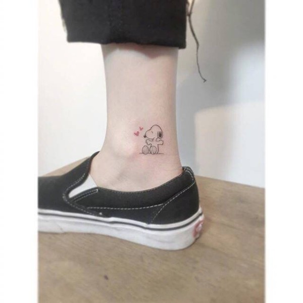 女生脚踝上黑色线条动漫卡通可爱史努比小图案纹身图片