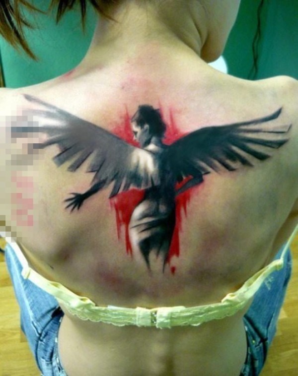 女生背部黑色素描点刺技巧翅膀纹身图片