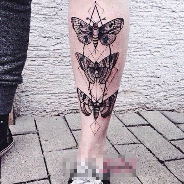 男生小腿上黑色点刺几何线条蝴蝶纹身图片