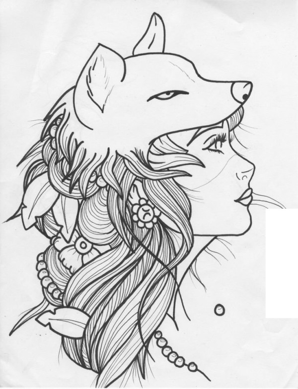 漂亮的黑色狐狸头女人简单线条纹身手稿