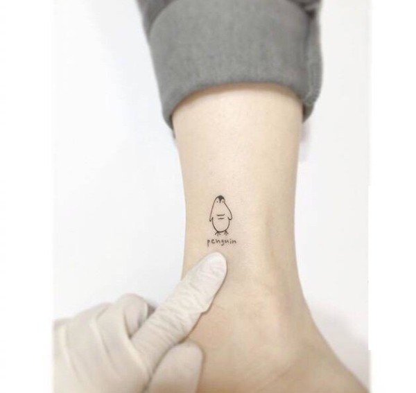 女生小腿上黑色英文单词和小动物企鹅纹身图片