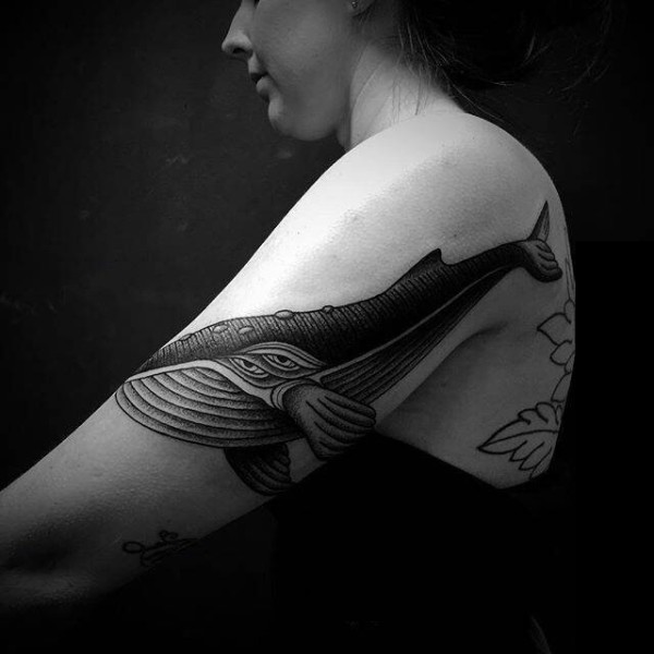 女生手臂上黑色素描点刺技巧动物鲸纹身图片