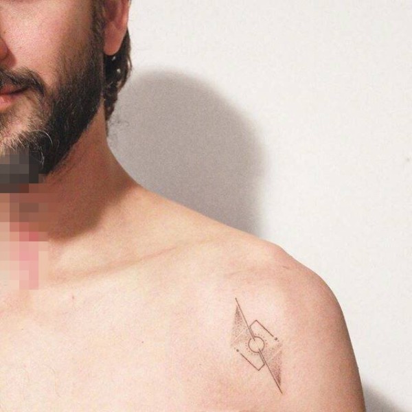 男生肩部黑灰点刺技巧几何线条创意纹身图片