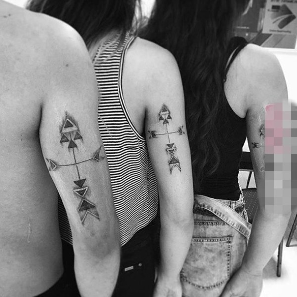女生手臂上黑色点刺几何线条箭头纹身图片