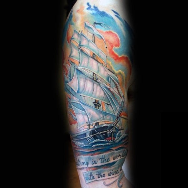 男生手臂上彩绘水彩创意帆船花臂纹身图片