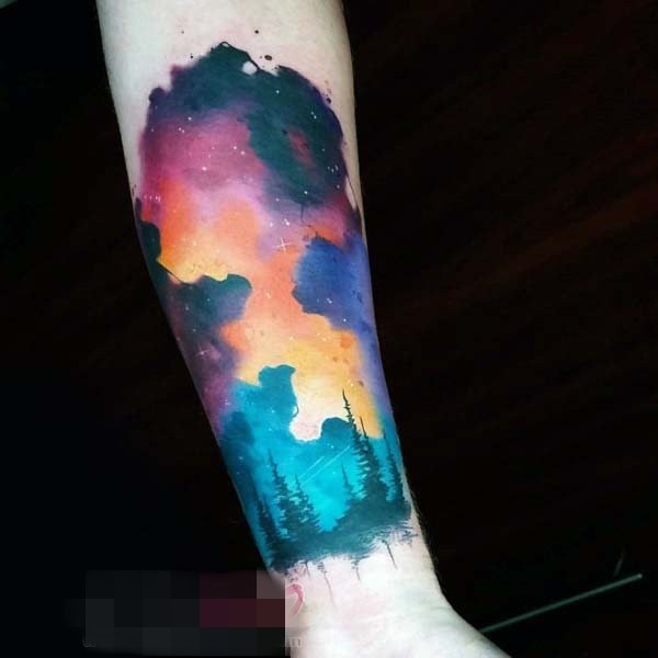 男生手臂上彩绘水彩创意森林里的夕阳纹身图片