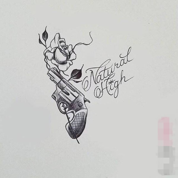 个性的黑色几何线条英文单词花朵和手枪纹身手稿