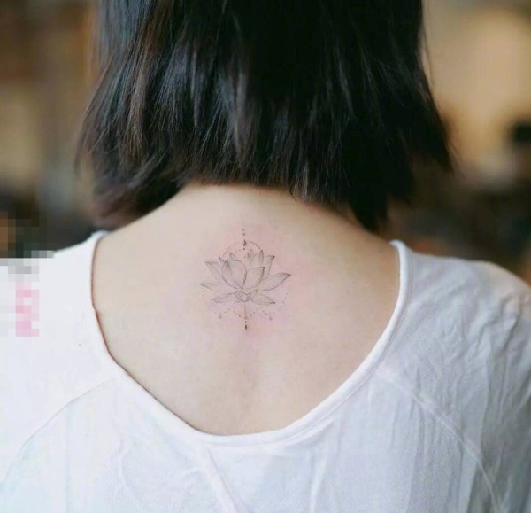 女生颈后黑色线条创意文艺小清新莲花纹身图片