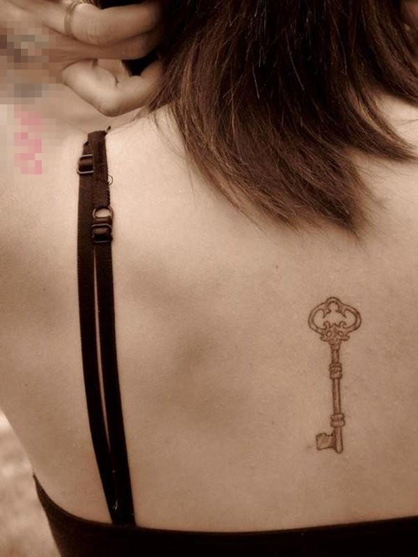 女生后背上彩绘点刺技巧几何元素抽象线条钥匙纹身图片