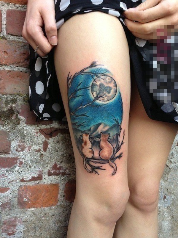 女生大腿上彩绘水彩创意月夜下的风景猫纹身图片