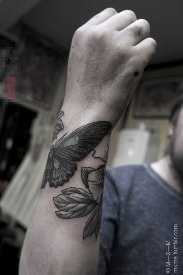 男生手臂上黑色点刺小动物蝴蝶纹身图片