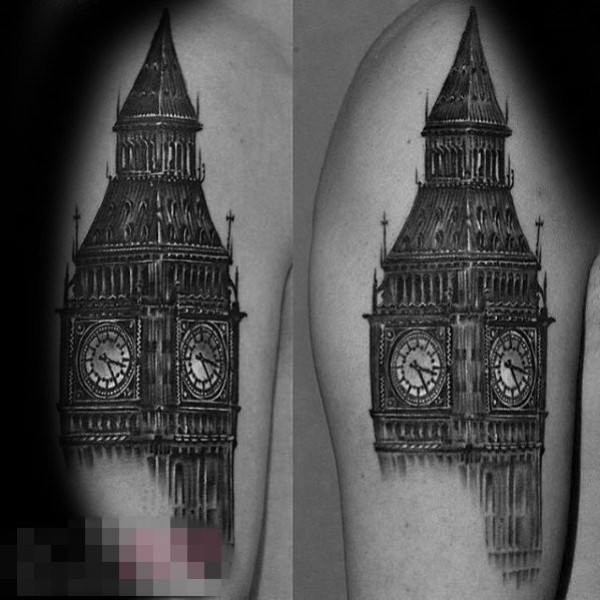 男生手臂上黑灰色素描技巧钟塔纹身图片