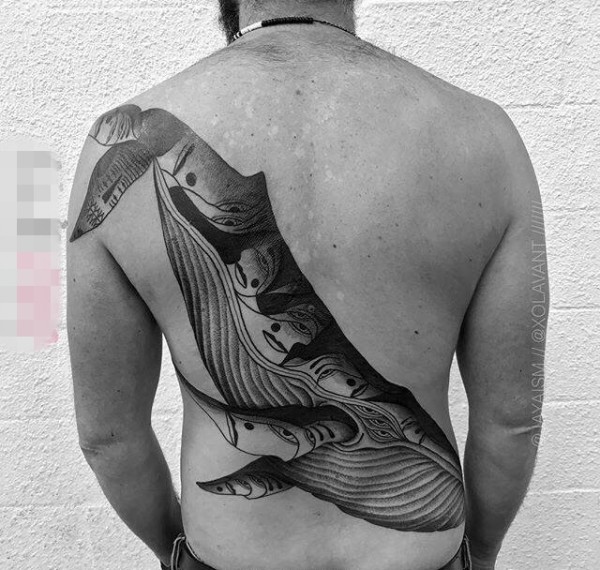 男生背上黑灰色简约线条点刺技巧鲸鱼纹身图片
