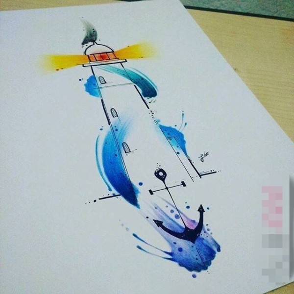 黑色线条灯塔水彩泼墨船锚纹身手稿