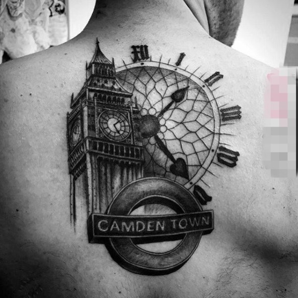 男生背部黑色线条点刺技巧经典建筑大本钟纹身图片