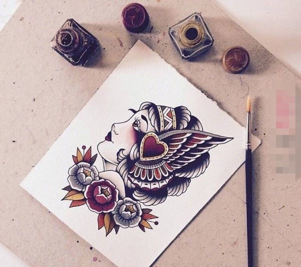 彩绘水彩创意印第安风格女生人像纹身手稿