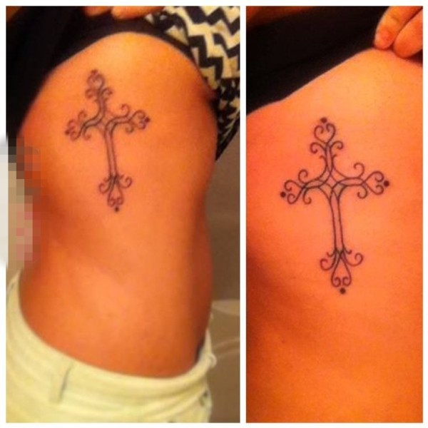 女生侧腰上黑色线条几何元素创意花纹十字架纹身图片