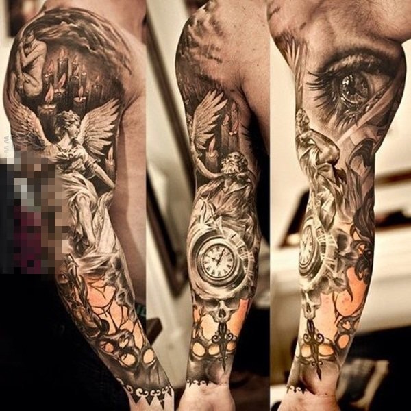 男生手臂上黑色素描点刺技巧创意个性花臂纹身图案