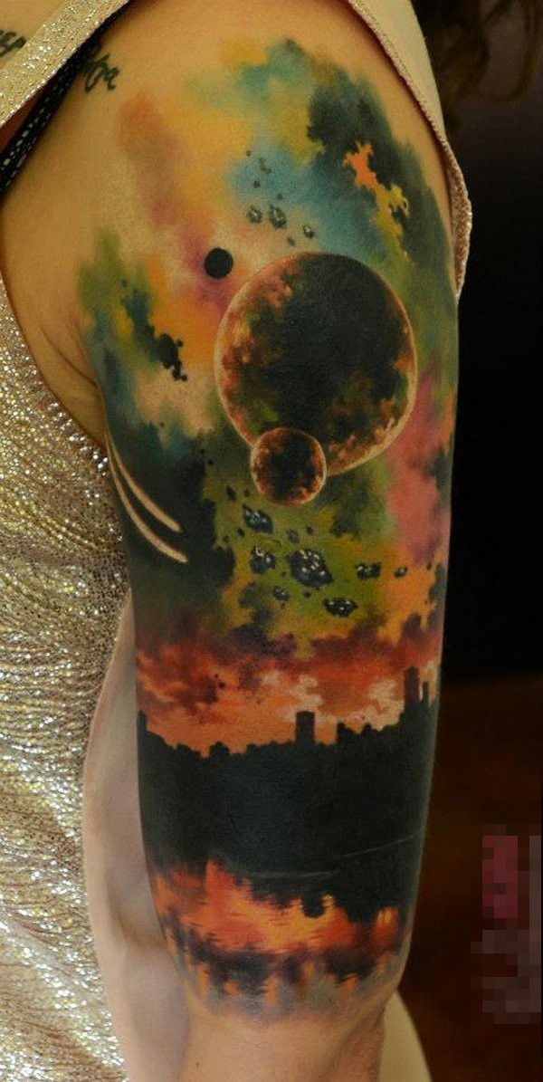 男生手臂上彩绘水彩创意落日星球风景纹身图片