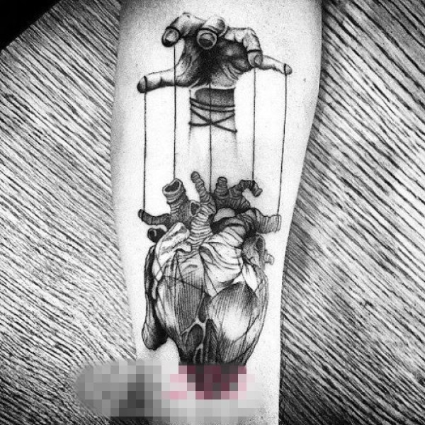 男生手臂上黑色素描点刺技巧创意心脏纹身图片
