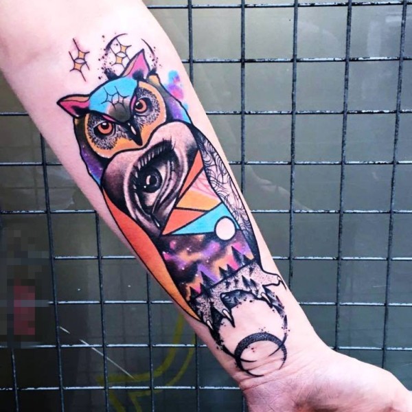女生手臂上彩绘水彩创意花臂猫头鹰纹身图片