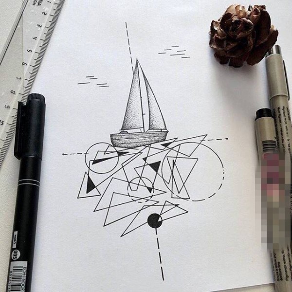 个性的黑色点刺几何线条帆船纹身手稿