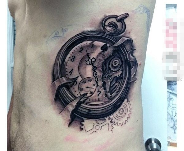 男生侧腰上黑色素描点刺技巧创意齿轮钟表纹身图片
