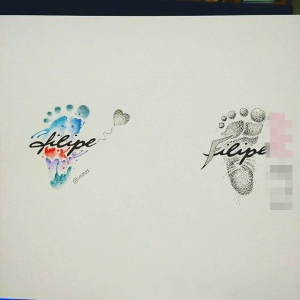 彩绘水彩描绘脚丫图案黑色线条花体英文纹身手稿