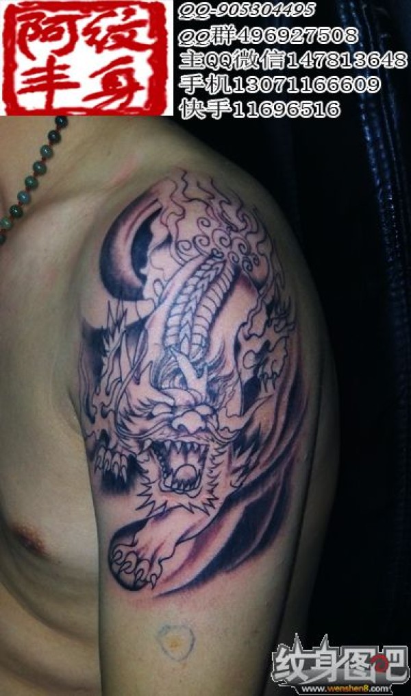 肩部黑色貔貅纹身 肩部纹身 肩部黑白纹身 肩部彩色纹身 肩部纹身图案 阿丰纹身 丰台纹身