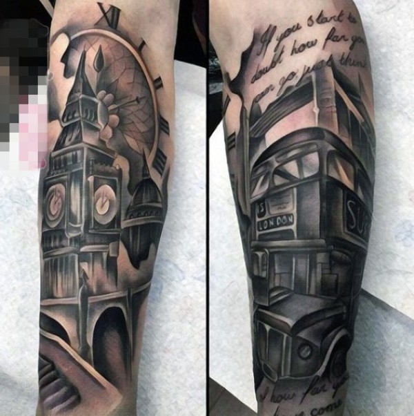 男生手臂上黑灰点刺立体几何雄伟建筑纹身图片