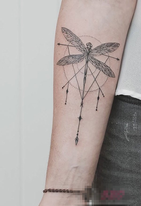 男生手臂上黑色线条几何元素创意蜻蜓纹身图片