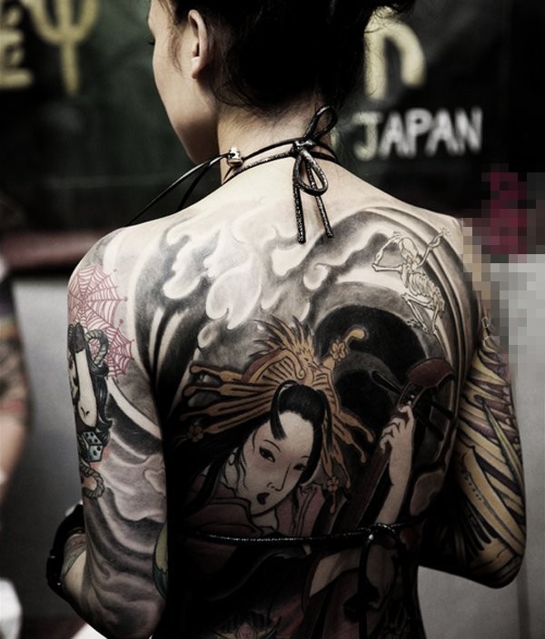 传统时尚的满背抽象线条创意艺妓纹身图案