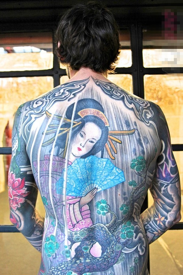 传统时尚的满背抽象线条创意艺妓纹身图案