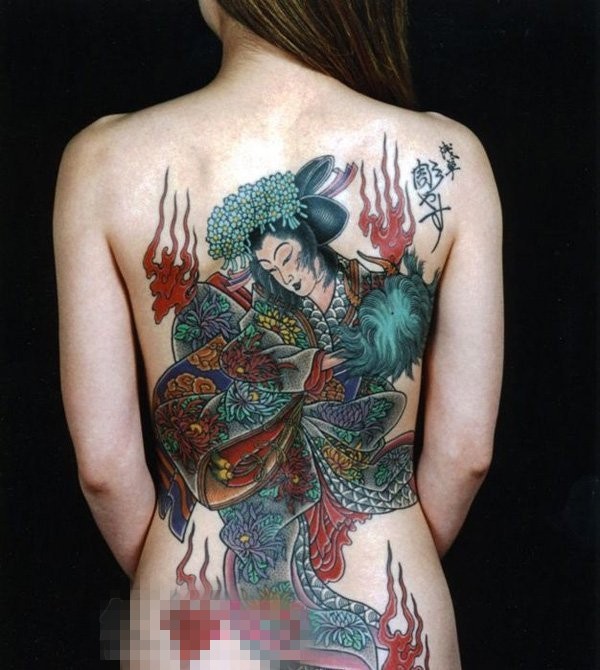 传统时尚的满背抽象线条创意艺妓纹身图案