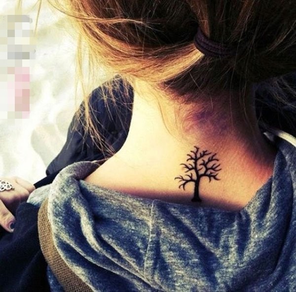 女生颈后黑色抽象线条植物枯树枝纹身图片