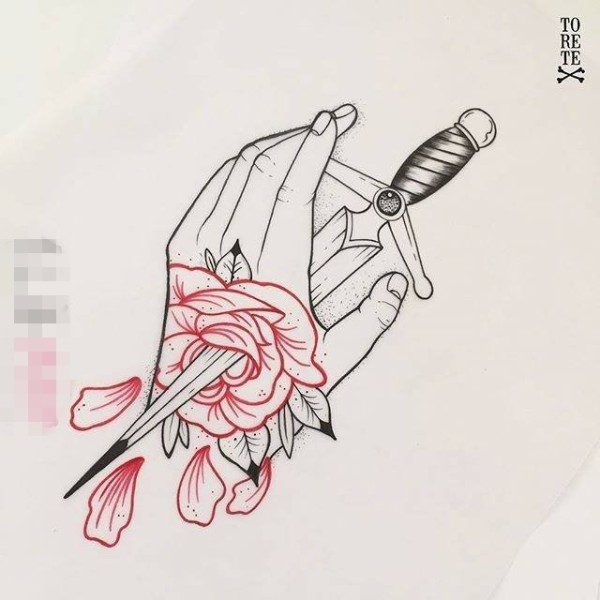 红黑线条创意手与玫瑰匕首纹身手稿