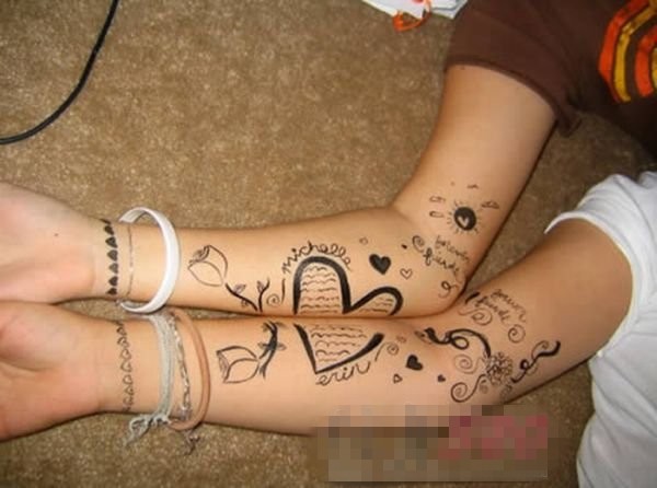 闺蜜手臂上黑色线条创意心形个性纹身图片