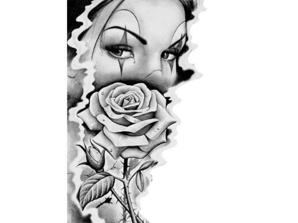 黑色素描唯美女生人像和玫瑰纹身手稿