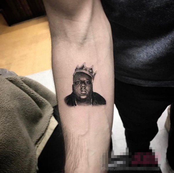 男生手臂上黑色点刺皇冠和人物肖像纹身图片