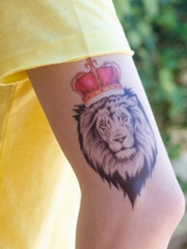 男生手臂上彩绘皇冠和黑灰点刺狮子纹身图片