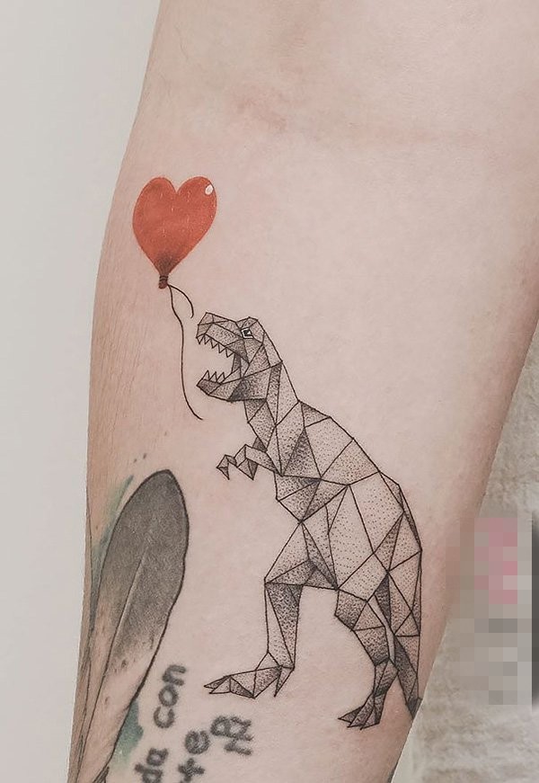 女生手臂上黑色几何线条恐龙和彩绘爱心气球纹身图片