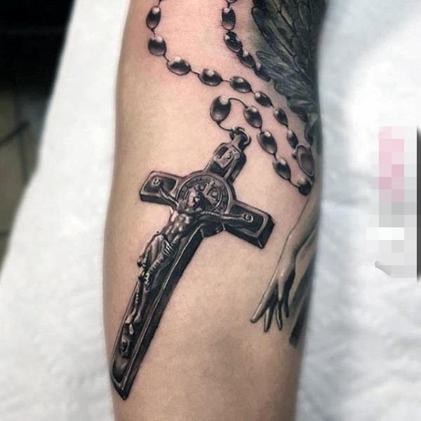 男生手臂上黑色点刺几何线条十字架纹身图片