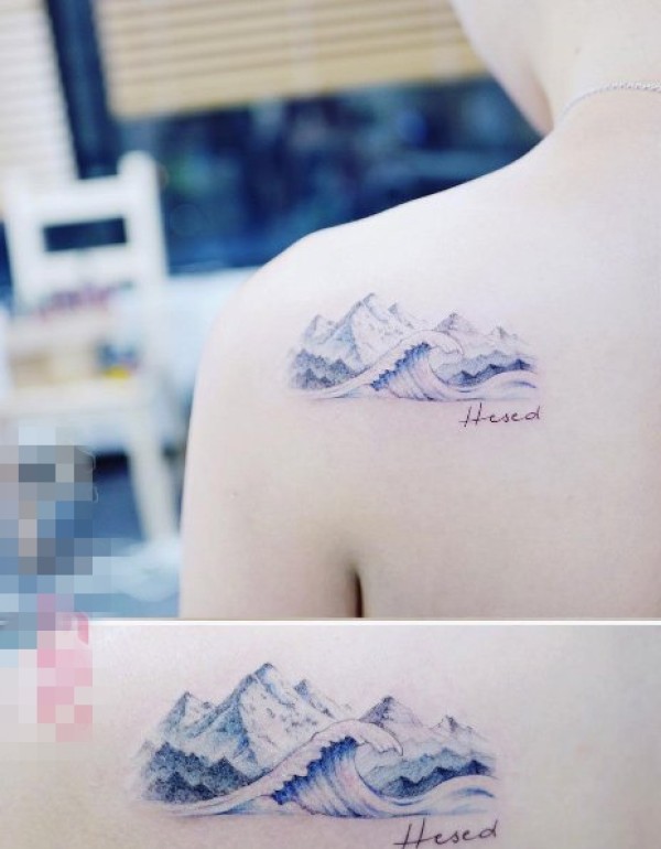 女生肩部彩色渐变山水海浪小清新纹身图片