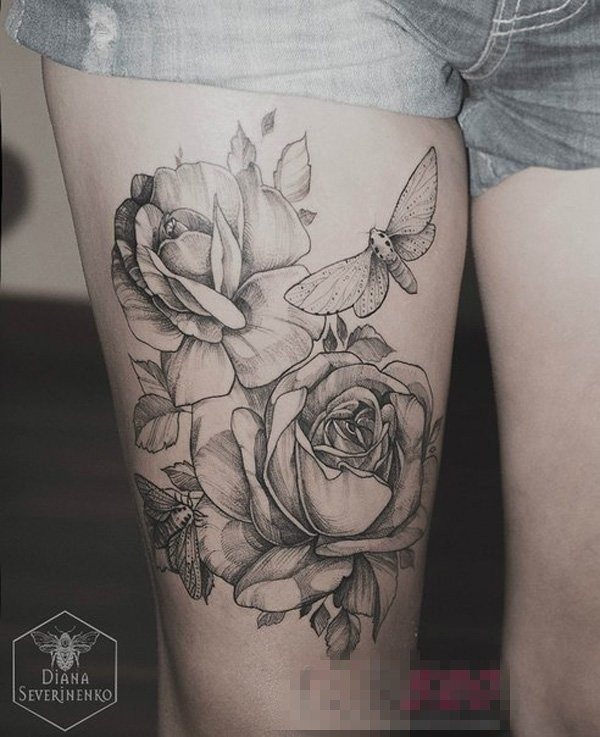 女生大腿上黑灰点刺小动物和花朵纹身图片