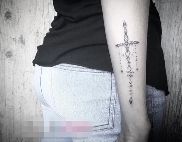 女生手臂上黑灰点刺几何线条符号剑纹身图片