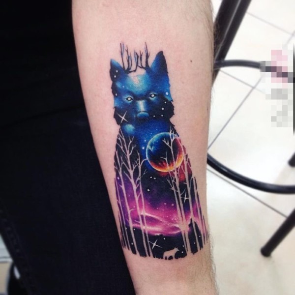 女生手臂上彩绘水彩星空风景狼纹身图片
