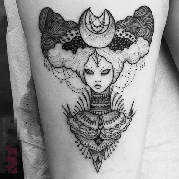 女生手臂上黑灰色点刺技巧线条人物肖像纹身图片