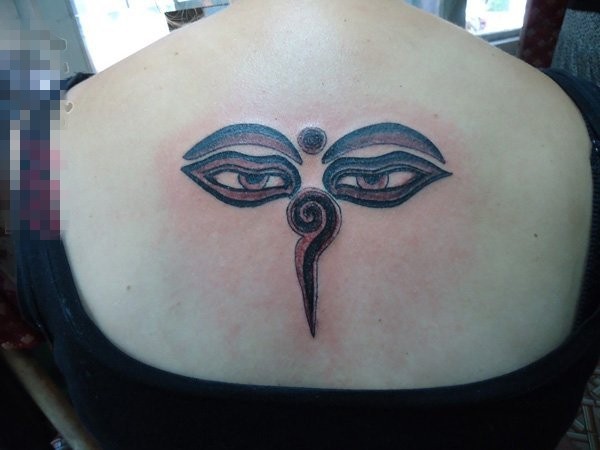 女生后背上黑灰色创意眼睛与符号纹身图片